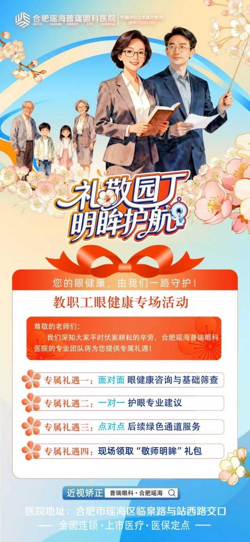 三尺讲台育桃李,一双明眸守光明。合肥瑶海普瑞眼科愿以专业的医疗技术、贴心的专属服务,为广大教职工卸下眼健康的烦恼,让各位老师既能清晰授课育英才,也能安心陪伴孩子守护好视力,让明眸之光照亮教书育人的道路!