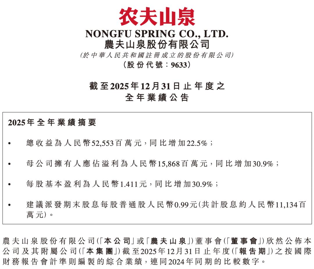 3月24日,农夫山泉发布2025年全年业绩。报告期内,公司营收525.53亿元,首次突破500亿元大关。利润158.68亿元,增长30.9%。农夫山泉董事长钟睒睒在业绩公告中表示,2025年公司饮用水业务已恢复增长,比2024年增长17.3%。