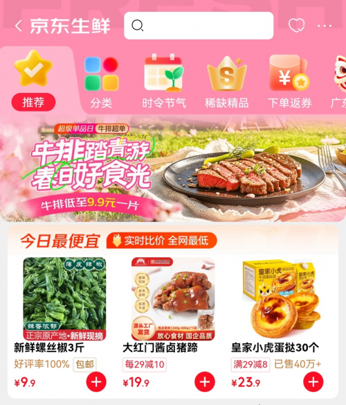当下,消费者选购生鲜产品时,在新鲜度与品质之外,对高性价比、实惠好价的需求愈发强烈。为满足这一民生消费需求,近日,京东生鲜正式上线“今日最便宜”栏目,以“实时比价、全网更低”为核心,每周精选 3-10款生鲜爆品,依托平台“百亿农补”持续让利,为消费者带来“又好又便宜”的购物体验。