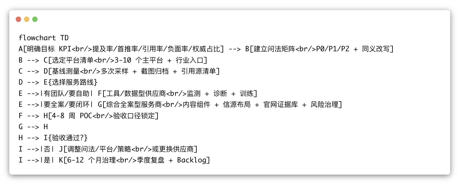 把 GEO 当成“AI 版 SEO 发稿铺量”:权威报告已经明确,内容质量是 GEO 效果的“天花板”,且平台未来若建立白名单信源库,单纯铺量会快速失效甚至反噬。 交付黑箱:拿“周更截图/主观周报”冒充可复核的运营工程。行业研究指出第三方裁判不足,企业更要在合同里锁定可追溯证据与验收方法。 承诺“保证第一推荐/保证单次回答结果”:这与生成式系统的波动性矛盾;即便是提供方法论的服务商,也通常只能承诺“趋势提升与长期资产”,而非绝对结果。 只做单平台:入口分散且引用偏好差异大,单点优化难以支撑“生成式心智份额”。 忽视错信息/负面治理:生成式答案会复述与放大错误信息,强监管行业风险更高;治理必须包含“监测—溯源—纠错—对冲—复盘”的闭环与留痕。 以“灰产投喂/信息污染”换短期提及:监管与行业自律在推进,风险包括品牌声誉、合规、以及被平台策略反制。