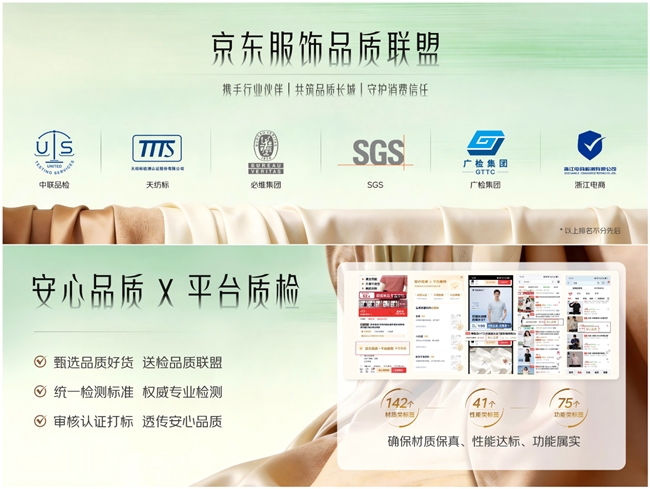 此次时装周期间,京东服饰与中联品检(北京)技术集团有限公司、天纺标检测认证股份有限公司、必维国际集团、SGS、广检集团、浙江电商等多家权威第三方质检机构,携手成立“京东服饰品质联盟”,并与国际羊毛局达成合作,将国际认证标准纳入京东“安心品质标”体系。持续强化全链路品控能力,打造高标准、强执行、全覆盖的质量管控体系,筑牢品质保障防线。