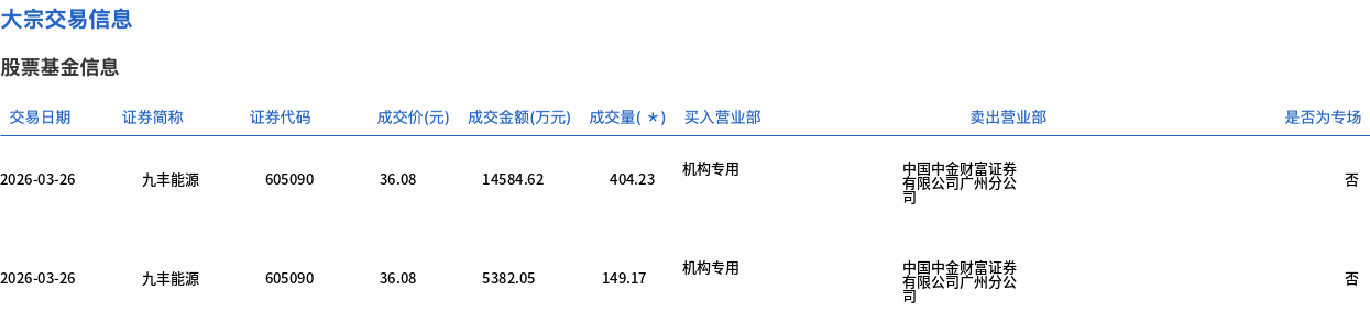 3月26日,九丰能源大宗交易成交553.4万股,成交额2亿元,占当日总成交额的31.92%,成交价36.08元,较市场收盘价38.55元折价6.41%。