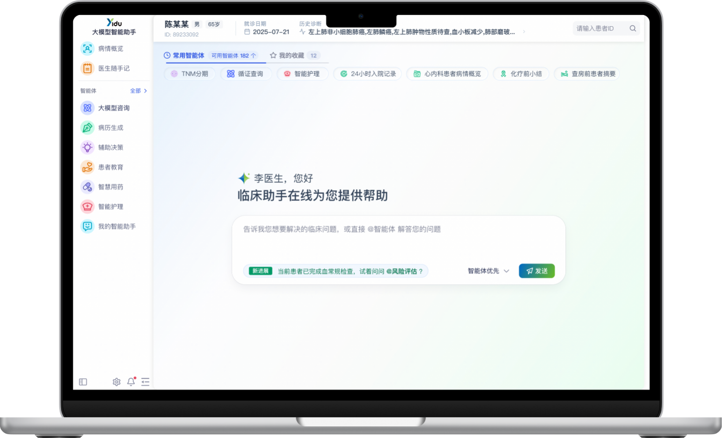 这些智能体均源自院内场景的深度打磨:医渡科技已在多家合作医院的真实临床环境中沉淀了200余个专科智能体,这些智能体经领域专属数据训练并完成临床场景深度验证。专科“顾问团”的协同发力,解决了通用AI“泛而不精”的痛点,为医生提供更贴合实际诊疗逻辑的决策支持。