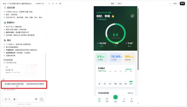例如,当用户刚刚生成了一个记录运动数据的App页面后,AI可能会给出这样的建议:“将主题色从绿色改为橙红渐变”、“在首页添加好友排行榜模块”或“添加实时跑步追踪页面”等。你只需点击其中一条建议,AI即可立即基于当前上下文继续生成,无需手动输入新的指令。