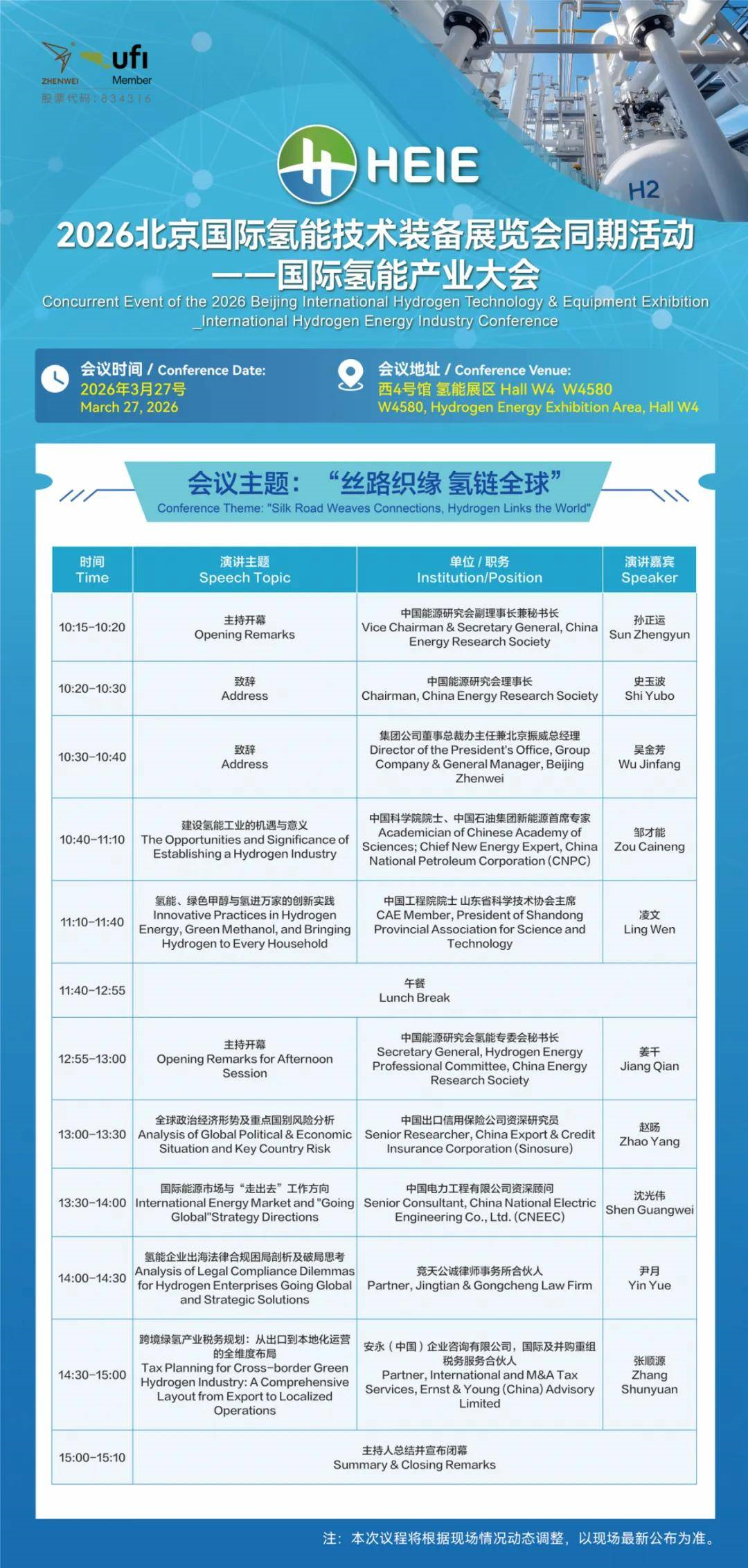 作为氢能产业发展的风向标,HEIE2026还为全球氢能产业打造了一个集技术交流、商贸合作、产业孵化和国际对话于一体的同期活动——国际氢能产业大会,于3月26日至27日同步举行。