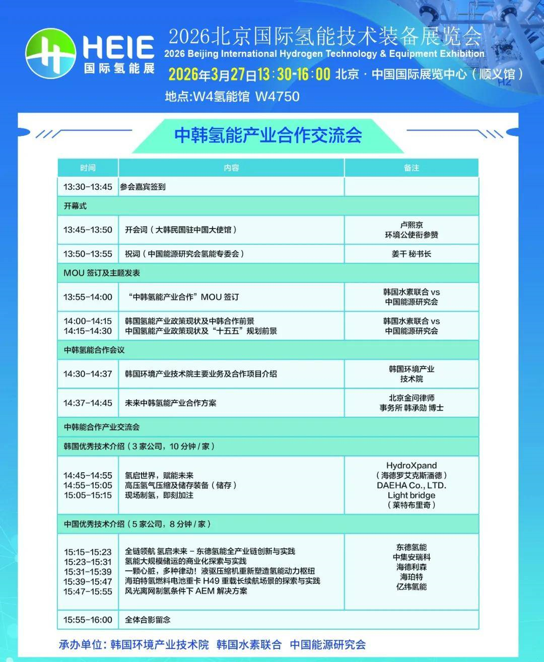 作为HEIE2026同期活动的重要组成部分,一场聚焦东亚氢能产业协同发展的高端对话——“中韩氢能产业合作交流会” 将在3月27日、于北京·中国国际展览中心(顺义馆)W4氢能馆W4750举行。本次会议由韩国环境产业技术院、韩国水素联合与中国能源研究会共同承办,旨在为两国产业界搭建一个务实、高效的对接平台,共同解读政策趋势、分享技术成果、探索商业机遇。