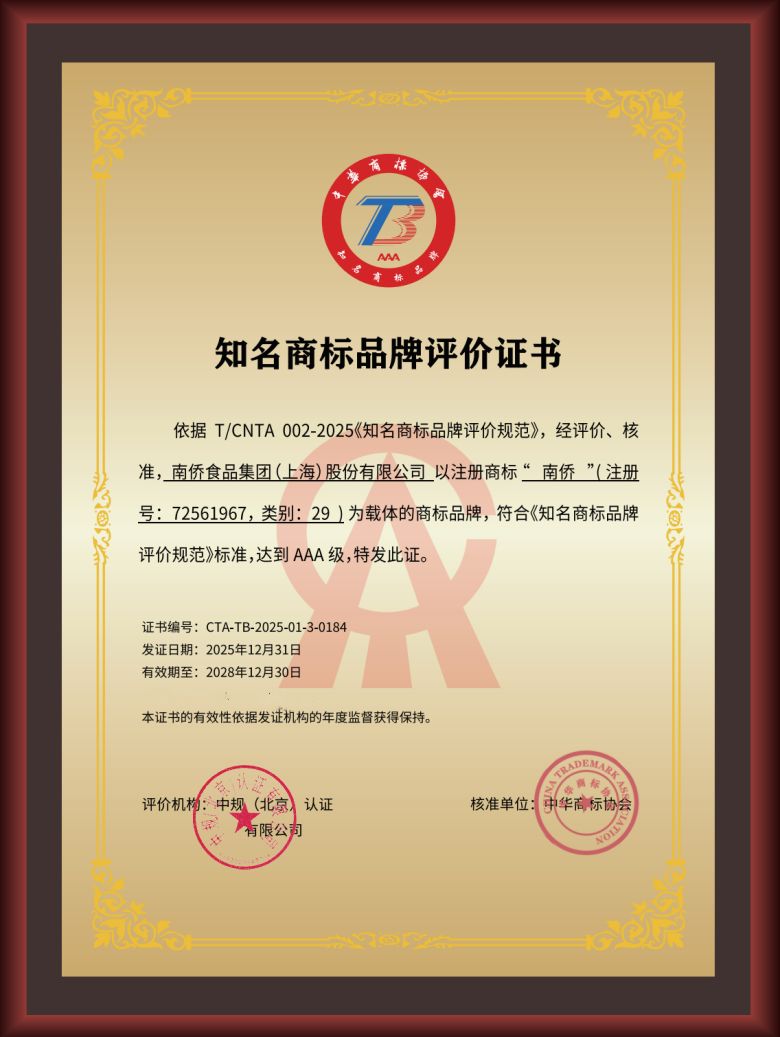 近期,南侨食品获得中华商标协会 AAA 知名商标品牌认定,成为 “食用油脂、鲜奶油、黄油” 细分品类首家获此认证的企业;这是公司继入选 2025 年度中国消费名品名单后,品牌影响力与行业竞争力再度获得国家级权威认可。