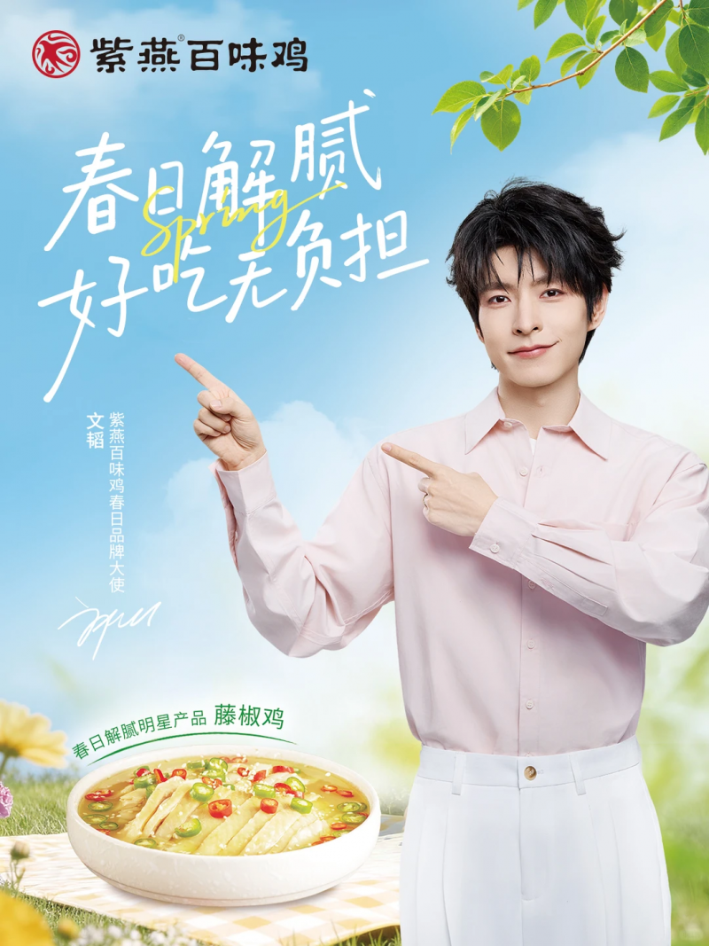 本次合作中,文韬所传递的轻盈、健康、富有活力的生活方式,与紫燕开春“轻”饮食方案形成了精准呼应。春分时节,人们追求饮食的清爽与均衡,而紫燕通过好原料与好工艺,将“轻”不仅体现在藤椒鸡的口味上,更融入便捷、健康的消费体验中。文韬温润儒雅的智性魅力,恰好契合年轻群体对松弛从容、质感生活的向往,也让紫燕“亲民、美味”的调性在春日氛围里更显鲜活生动。围绕大众化、亲和力、年轻化、健康生活等维度,紫燕持续丰富品牌形象,在创意营销与品牌价值的统一中,传递出“好原料+好工艺=好产品”的核心信息,让品牌在春日焕新之际实现多圈层、立体式触达。