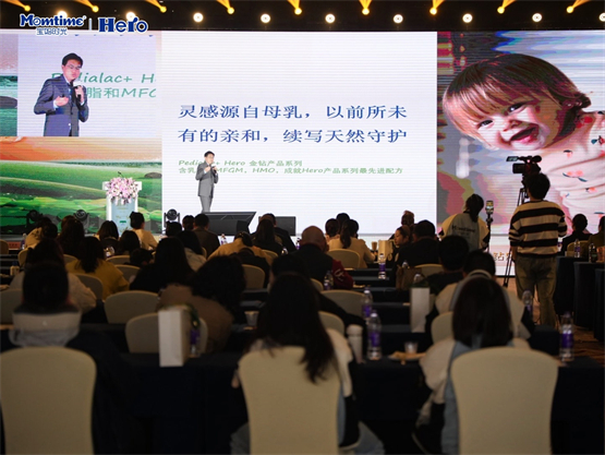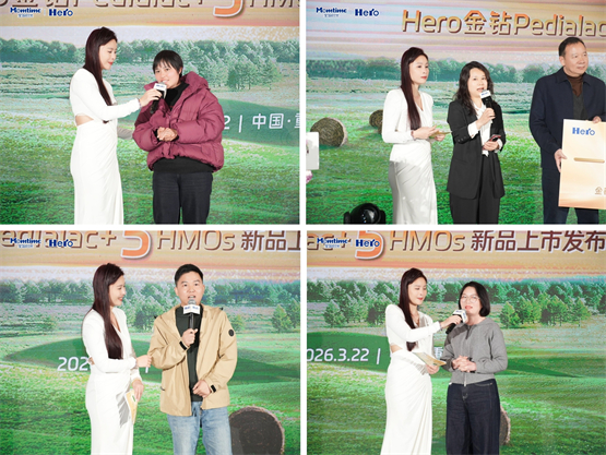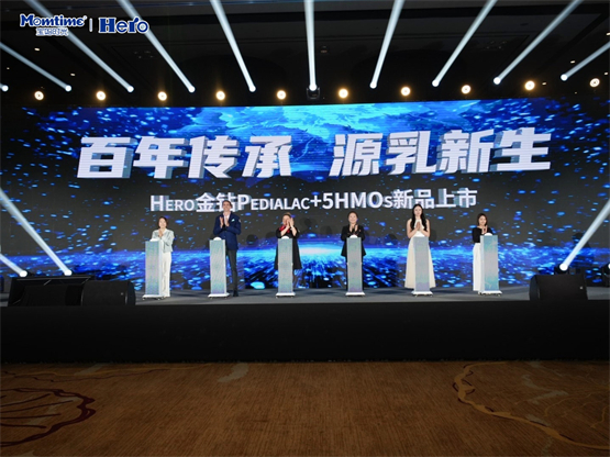 发布会现场迎来重磅高光环节,Hero集团与宝妈时光核心高管、消费者代表及优秀渠道服务商代表共同登台,携手完成新品耀世启动仪式。随着全场整齐的倒计时落幕,Hero金钻Pedialac+5HMOs正式宣告上市,标志着Hero在中国婴幼儿营养市场迈入深耕细作、共赢发展的全新阶段。