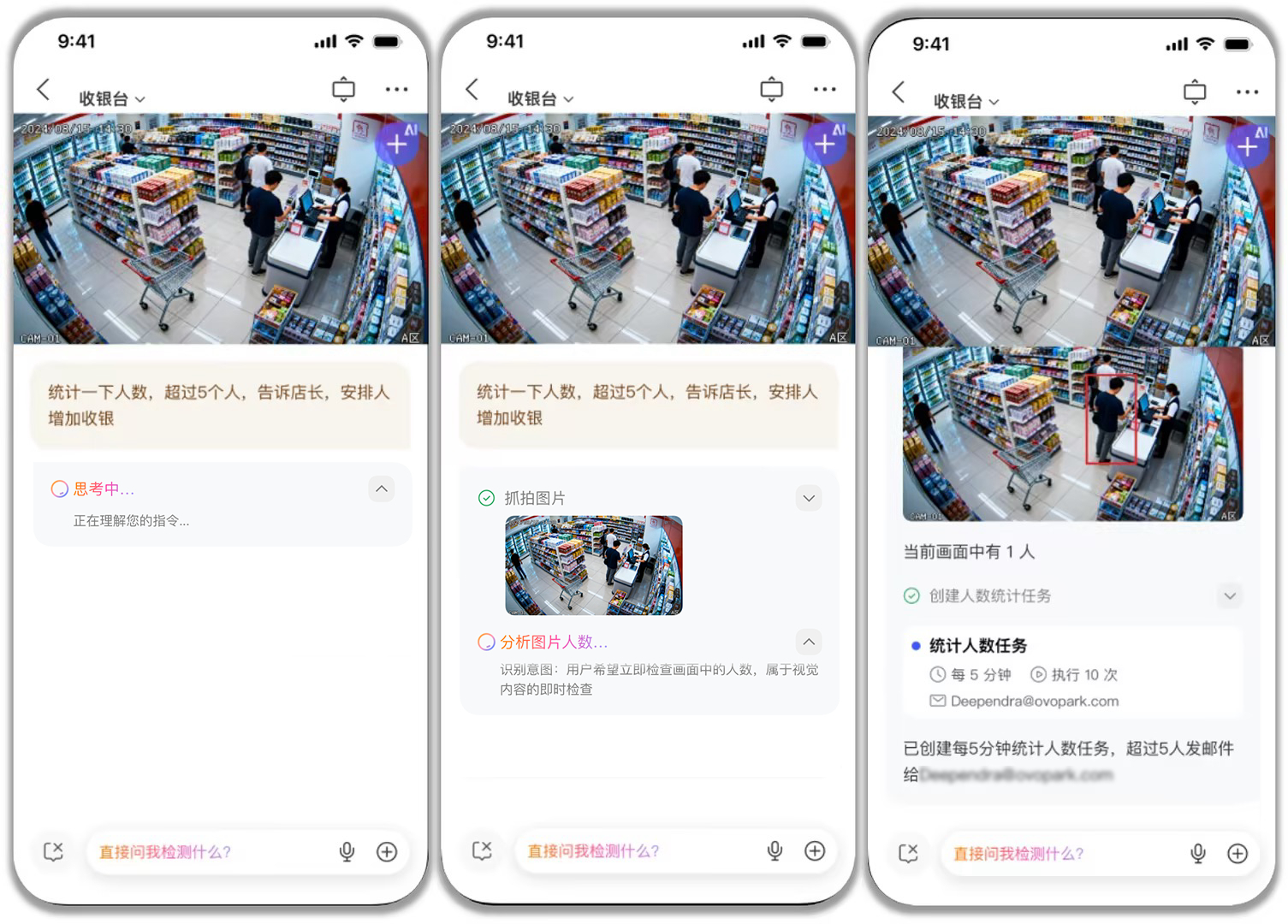 如:说一句「看下收银台有多少人在排队」,摄像头自动旋转定位到目标位置,对问题进行回答;