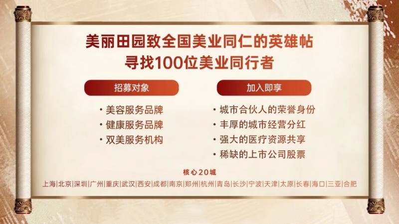 2026年3月,集团重磅举办“寻找100位美业同行者”战略投资暨行业赋能发布会,宣布将聚焦中国20个高线城市的美与健康服务机构,诚邀更多行业伙伴融入美丽田园生态体系,依托持续打磨精进的商业系统为行业伙伴提供全方位赋能提效,实现共生共赢。