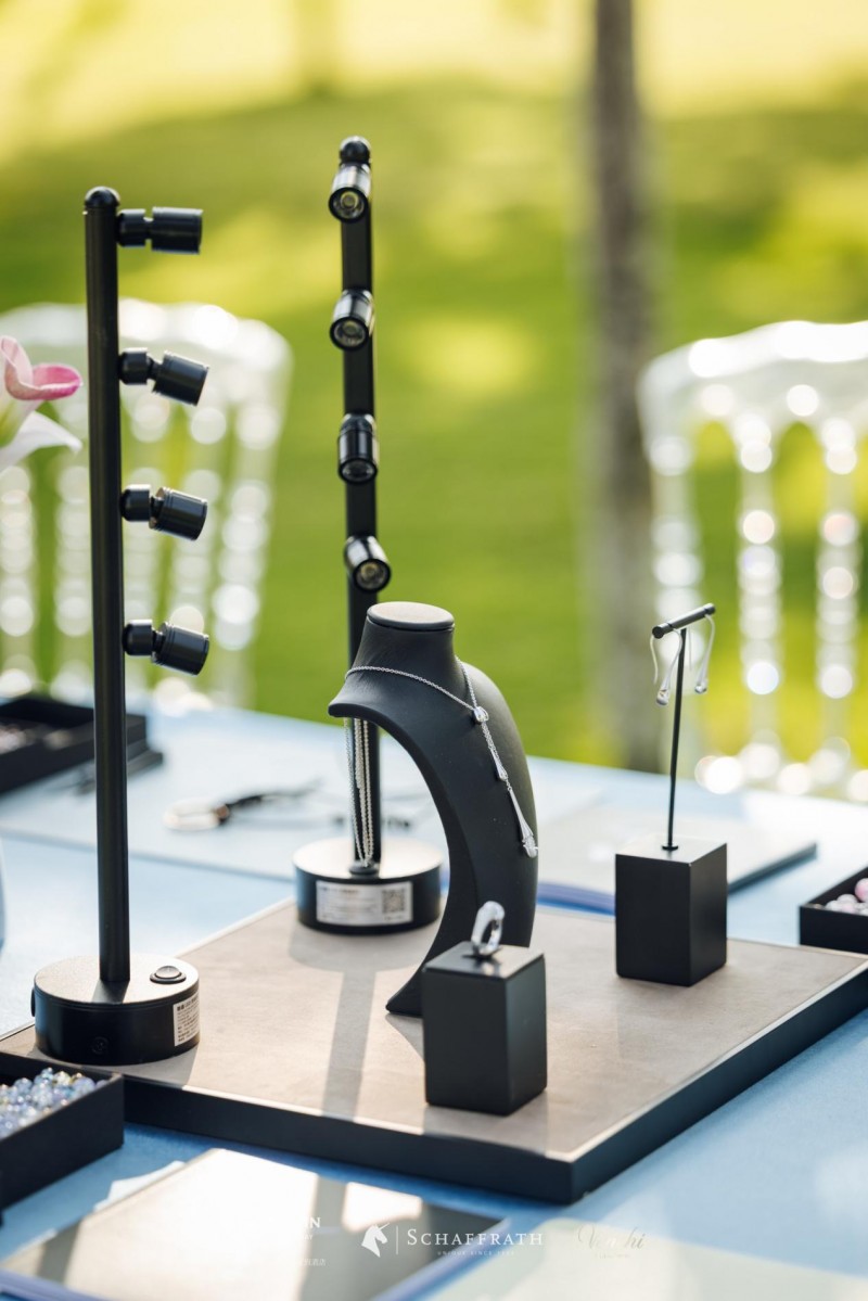 本次婚礼秀以“水”的形态演变隐喻爱情的生命历程,从“朝露·初凝”的宾客入场,到“涟漪·相触”的鸡尾酒会,再至“水汀·相映”的浪漫晚宴,最终于“潮汐·永恒”的无人机秀中达到高潮。作为核心亮点之一的德国高级珠宝沙夫拉特SCHAFFRATH,于第二篇章“涟漪·相触”环节中,设立了专属的珠宝展示区,让来宾在沉浸于休闲度假格调与乐队的悠扬旋律时,亦能近距离品鉴源自德国的珠宝艺术,其重点呈现的与婚嫁场景深度契合的两大高级珠宝系列,以不同的设计哲学回应类现代伴侣对爱情多元化的诠释: