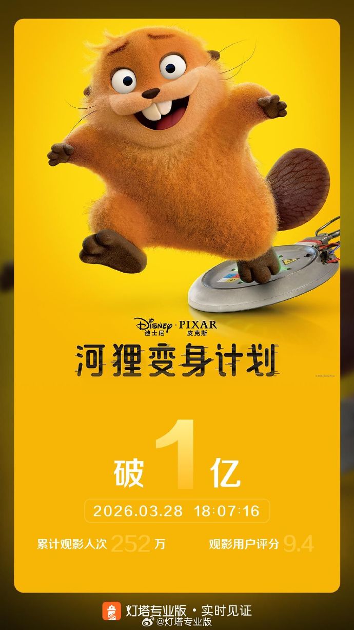 据灯塔专业版实时数据,截至3月28日,影片《河狸变身计划》票房突破1亿。