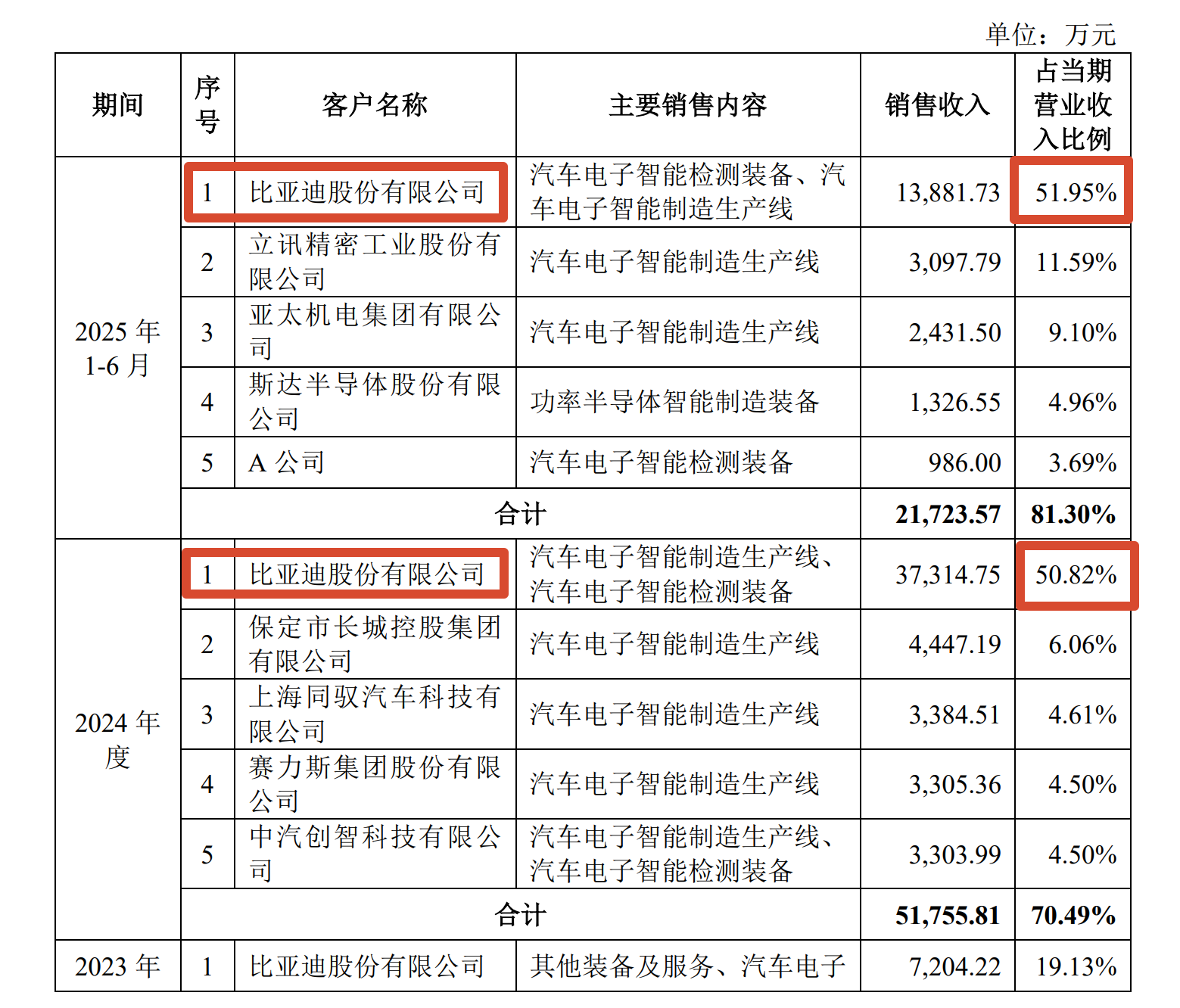 2022年至2025年上半年,沃镭智能前五大客户收入占比分别为56.59%、65.03%、70.49%和81.30%,呈持续攀升态势。其中,第一大客户比亚迪的收入占比更是从2022年的27.28%升至2024年的50.82%,2025年上半年进一步升至51.95%,超过半数收入依赖单一客户。沃镭智能更自称是为比亚迪“天神之眼”智驾系统批量提供域控制器生产级检测装备的战略供应商。这种紧密合作是沃镭智能业绩高速增长的核心驱动力。2022年至2024年,沃镭智能营业收入从2.62亿元升至7.34亿元,复合增长率高达67.25%。然而,硬币的另一面是巨大的单一客户依赖风险。