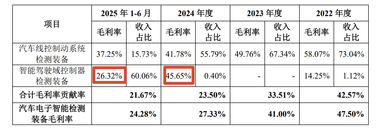这种高度依赖背后,是沃镭智能对核心客户的议价能力受限,招股书中的数据似乎也印证了这一点。2022年至2024年,沃镭智能线控制动系统检测装备的毛利率从58.07%一路下滑至41.78%。公司解释称,主要受比亚迪采购量变化及客户结构影响。另外,2024年,沃镭智能智能驾驶域控制器检测装备毛利率为45.65%,但2025年上半年该产品毛利率降至26.32%,降幅接近20个百分点。公司表示, “由于该批次为首次大批量交付,产品方案及工艺成熟度有待提升,整体毛利率相对较低”。但市场普遍猜测,这与沃镭智能为维系比亚迪合作关系而采取的让利策略密切相关。“当一家公司收入高度集中于单一客户,就不得不接受客户的定价压价要求,长期来看盈利能力会持续受损。” 徐鑫对界面新闻记者表示。