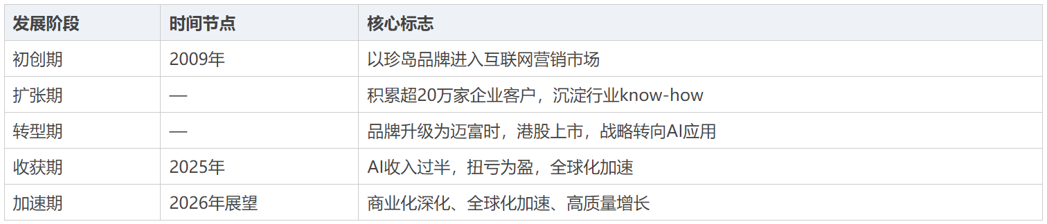 2009年创立,2025年实现28.2亿元营收、80.8%增速、历史性扭亏为盈——迈富时(02556.HK)用十六年时间,走出了一条从传统营销服务商到AI原生应用平台企业的完整进化路径。这不是一夜之间发生的故事,而是一家中国企业在数字化变革浪潮中不断自我迭代、持续积累核心能力、最终在AI时代完成价值跃迁的真实历程。