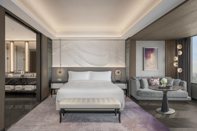 酒店由伦敦KCA国际事务所与深圳CCD郑中设计事务所两大顶尖团队联袂操刀,以“流光楚韵”为设计核心,将武汉江河交汇的城市气韵与楚地文化精髓转化为当代空间语言,成为综合体极具辨识度的文化标识。流畅线条勾勒江水灵动之态,层叠材质彰显楚文化的含蓄典雅。东湖烟雨的静谧、云梦泽境的生机、编钟礼乐的历史回响与楚舞纹样的当代演绎,交织于空间细节之中,引领宾客在光影与艺术之间展开一段以“鸿鹄东来”为主题的云端艺旅。