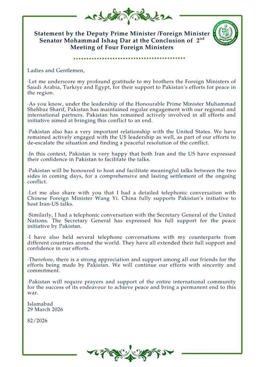 据央视新闻,达尔29日发表声明,通报了当天巴基斯坦、土耳其、埃及和沙特阿拉伯四国外长会成果。声明说,达尔简要介绍了在巴首都伊斯兰堡举行美国和伊朗谈判的前景,与会各国外长表示全力支持。四国决定成立一个由四国外长组成的委员会,协商制定解决冲突的具体方案。