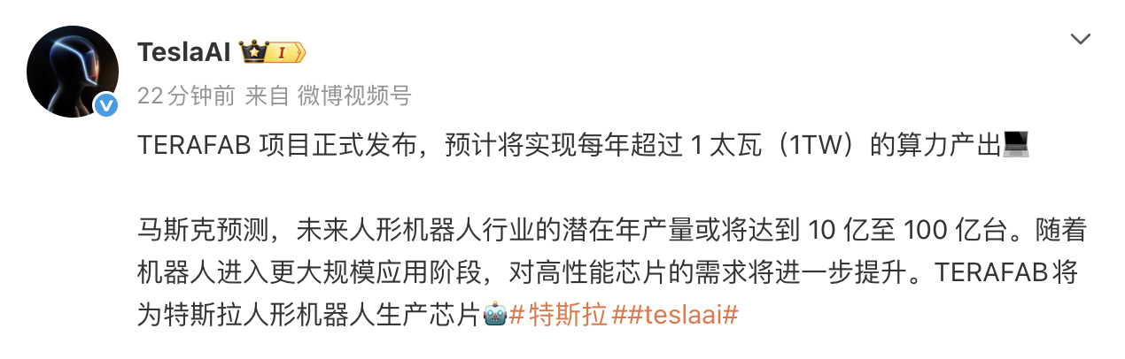 3月30日,@TeslaAI 发文称,TERAFAB项目正式发布,预计将实现每年超过1太瓦(1TW)的算力产出。TERAFAB将为特斯拉人形机器人生产芯片。