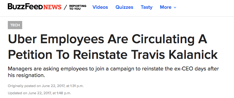 【一份恢复卡兰尼克CEO职位的请愿书在Uber内部流传】据BuzzFeed报道,在Uber CEO卡兰尼克辞职两天之后,该公司内部正在流传一封邮件,意在情愿恢复卡兰尼克执行总裁职位。