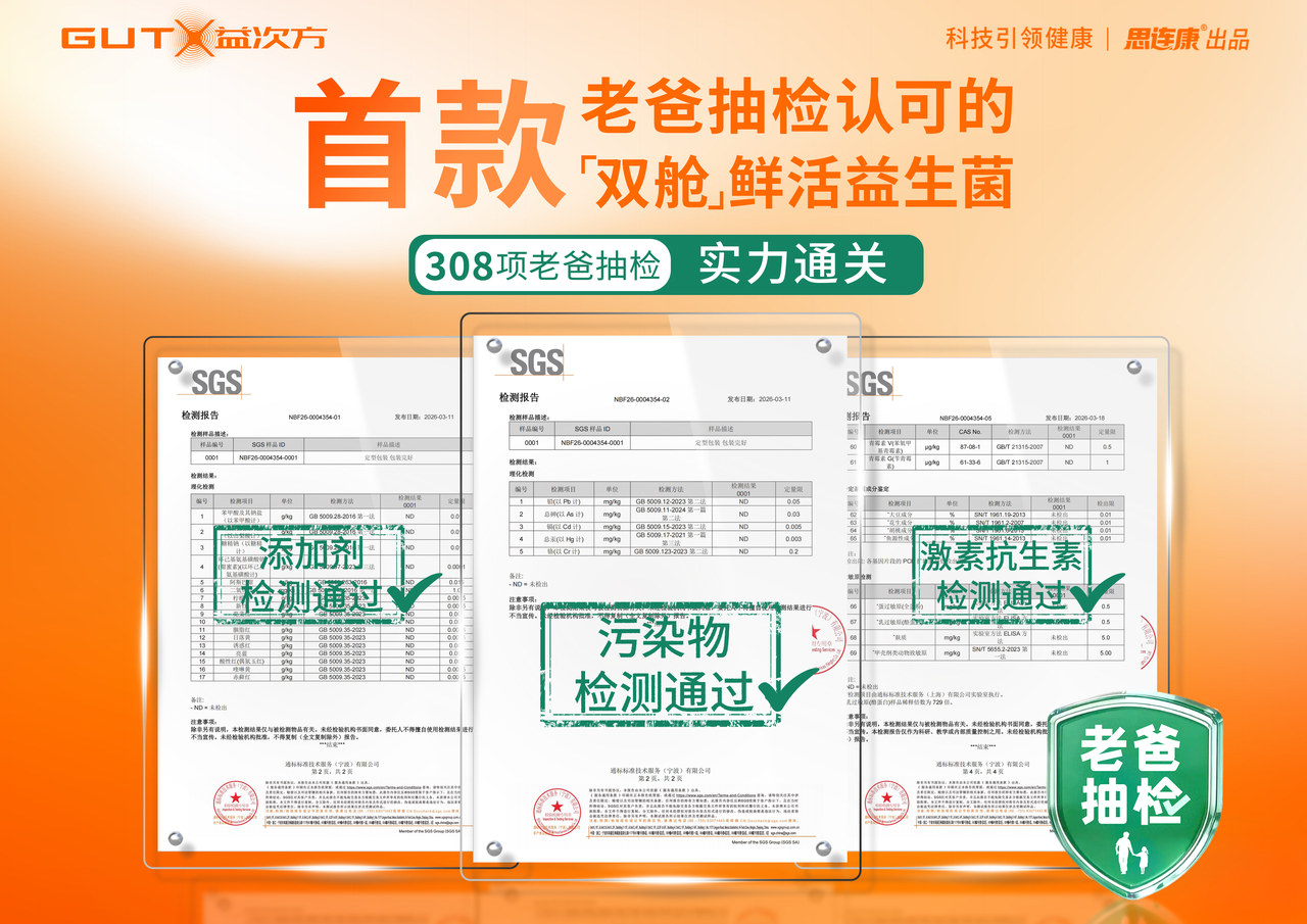 为了向消费者传递更深层次的安全信号,“老爸评测”在2020年推出了一项综合性技术服务——“老爸抽检”,对产品进行全链路的科学验证。值得一提的是,GUTX益次方双舱鲜活益生菌正是首款获得“老爸抽检”品牌标志授权的双舱鲜活益生菌产品。获得“老爸抽检”品牌标志授权,意味着产品不仅要经受最细致入微的最终检验,更要穿透产品的整个生命周期,确保其从原料初筛、工厂合规到最终产品有效性的每一个环节都达到严苛标准。