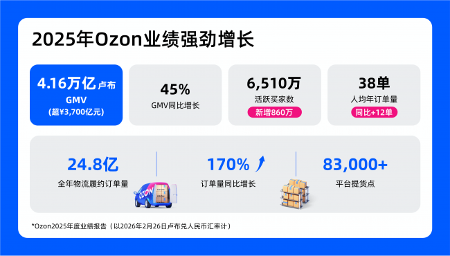 2025年Ozon平台实现跨越式增长,全年GMV达4.16万亿卢布,较上年实现45%的强劲增长,活跃买家数达6,510万,全年净增860万新用户。用户参与度显著提升,人均年订单量达到38单,较上年增加12单。