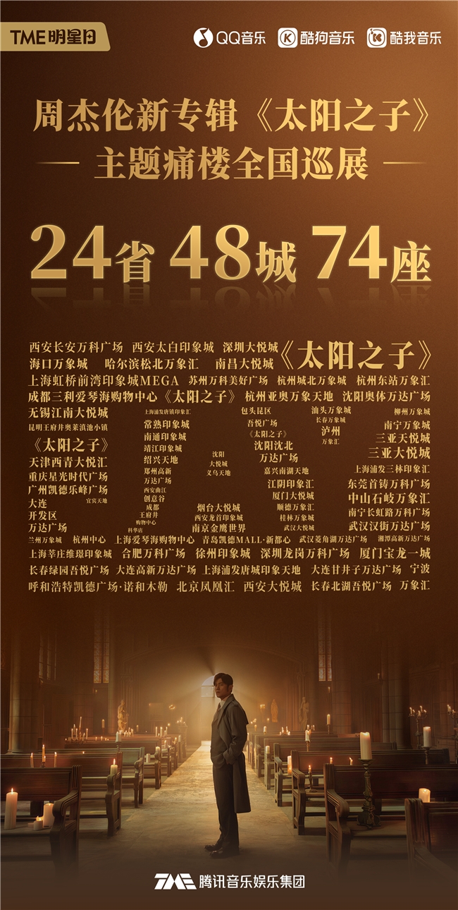 线下,腾讯音乐在中国48个城市打造了74座周杰伦《太阳之子》主题痛楼,还有无人机表演等诸多应援活动。据悉腾讯音乐还在美国纽约时代广场,以及中国多个城市的核心商圈上线周杰伦应援大屏,邀请全球粉丝应援打卡,让全球粉丝深度感受周杰伦音乐的魅力。