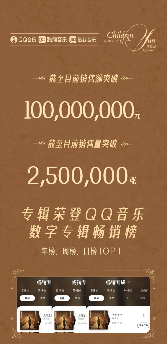 3月25日,华语流行歌手周杰伦第16张个人专辑《太阳之子》在腾讯音乐旗下QQ音乐、酷狗音乐、酷我音乐独家首发上线。自3月19日预售开启,该专辑销量迅速攀升,目前全平台销售额突破1亿人民币,印证了其强大的市场号召力。