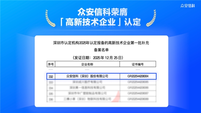 3月23日,众安信科上榜全国高新技术企业认定管理工作领导小组办公室公示的深圳市认定机构2025年认定报备的高新技术企业第一批补充备案名单。