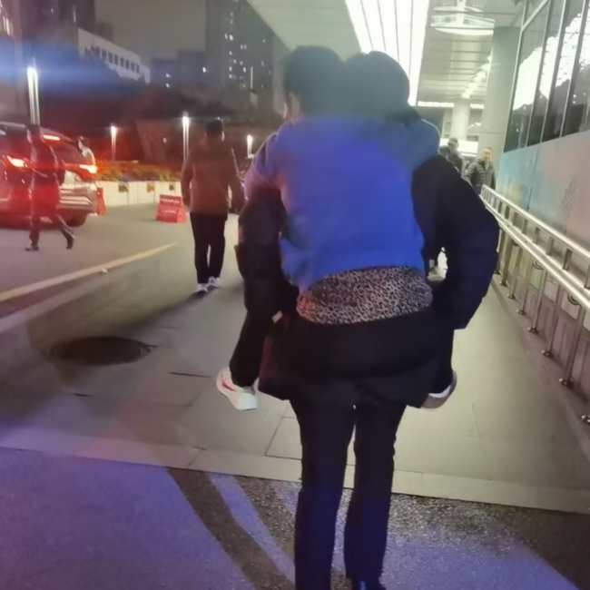 接到电话后,刘文轩没有耽搁,立刻叫上同事许士星赶往老人住处。到现场时,老人脸色发白,无法自己走路。刘文轩俯下身把奶奶背了起来,一路送往附近的医院。