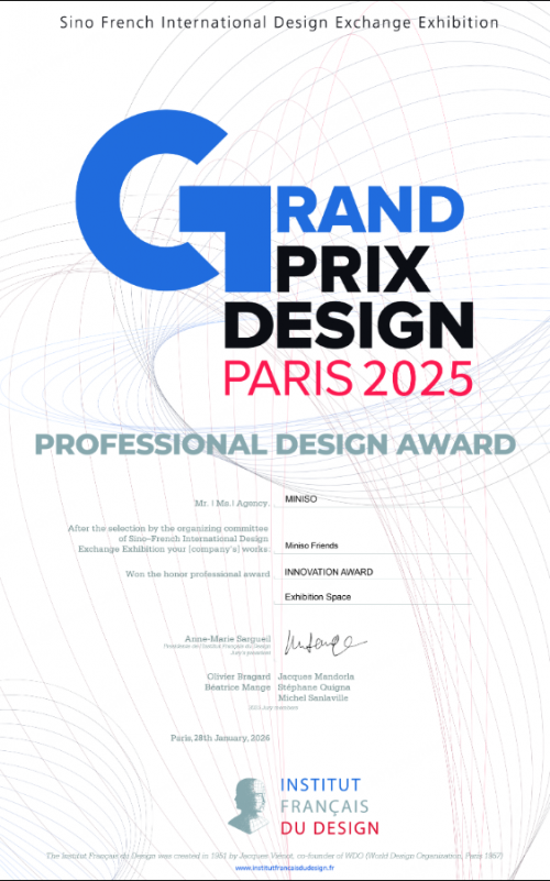 日前,名创优品MINISO FRIENDS斩获设计领域的重磅奖项——法国 GPDP AWARD 国际设计大奖“国际创新设计奖”,这也是该店态继拿下2025 年伦敦设计奖铂金奖后,再度斩获国际设计界权威奖项,充分彰显名创优品在零售空间创新、IP场景打造与可持续设计上的全球竞争力。与此同时,MINISO FRIENDS 全球化布局正加速推进,截至目前全球门店已达17家,海外首店已正式落地马来西亚。
