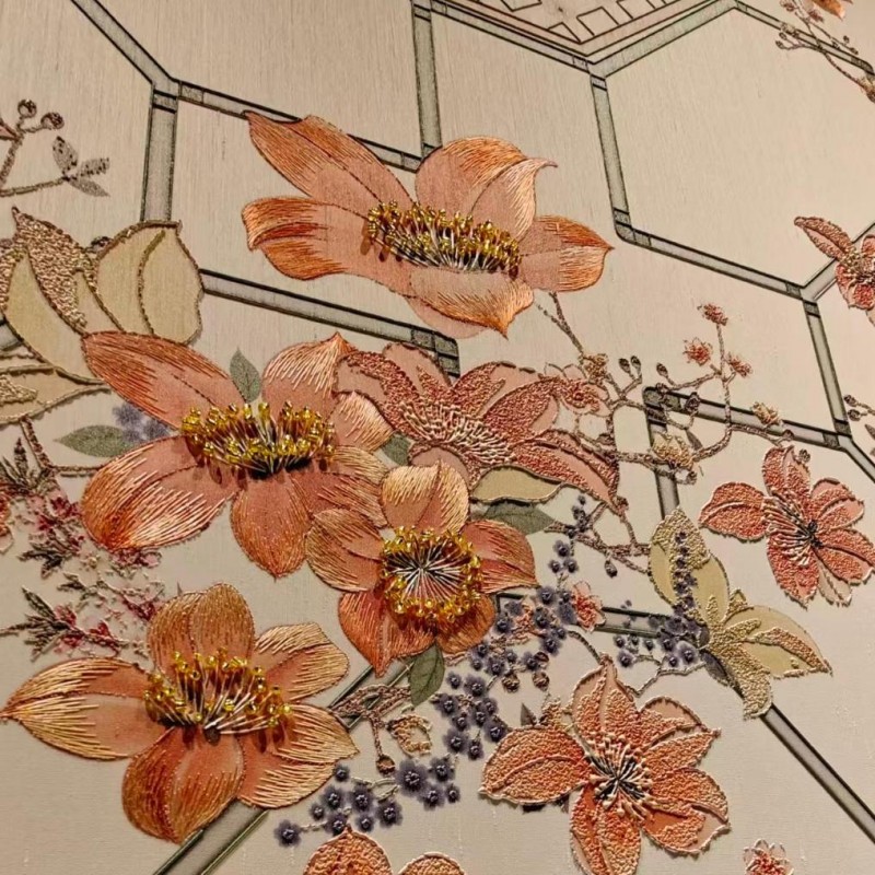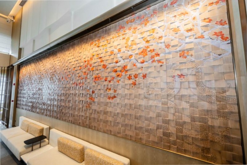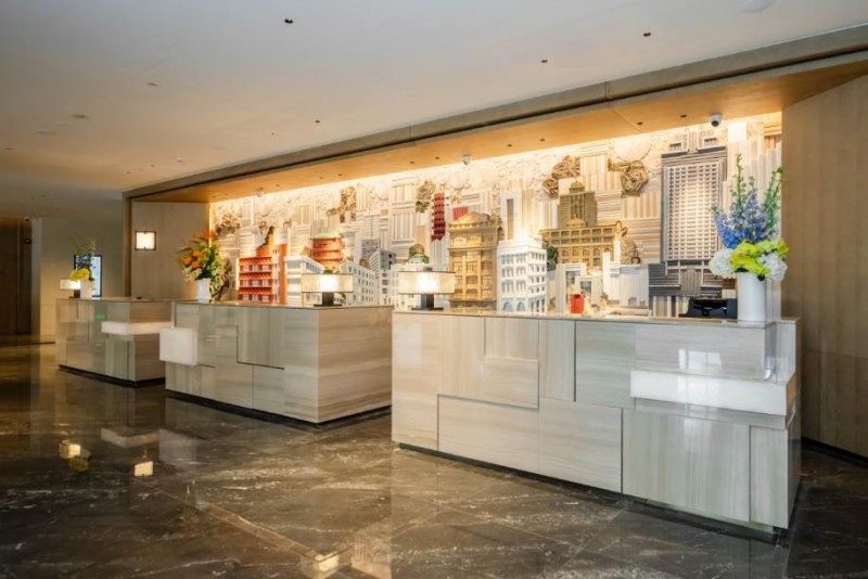 酒店大堂背景墙以雕版印刷为灵感,通过书籍、纸雕、木块的有序排序与艺术重组勾勒出雕版印刷的凹凸肌理,并将木棉花色与岭南建筑意象巧妙融于其中,以北京路“城央书坊”的文艺底蕴,刻画出古代中轴线起止点以及现代城市中轴天际线的街景,将北京路书坊产业传奇与广州古、现代中轴线的千年变迁娓娓道来,每一处肌理都藏着城市的记忆与温度。