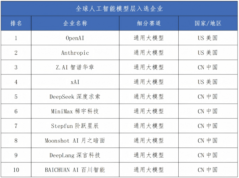 模型层共10家企业入选,形成中国企业数量领先、美国企业技术引领的竞争特征。