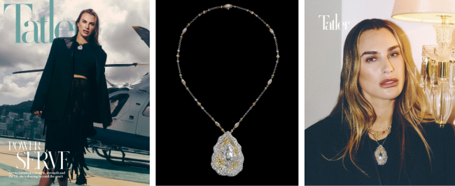 封面大片中,萨巴伦卡身着高级时装,佩戴来自Claudia Ma Fine Jewellery、Carnet Jewellery与Hearts On Fire的天然钻石高级珠宝,展现出与赛场上凌厉形象截然不同的柔和与自信。无论是花式切割的天然彩钻耳环,还是心形黄钻戒指,亦或是内外皆璀璨的钻石手链,每一件珠宝都恰如其分地映衬出她的独特气质——不张扬,却自有光芒。