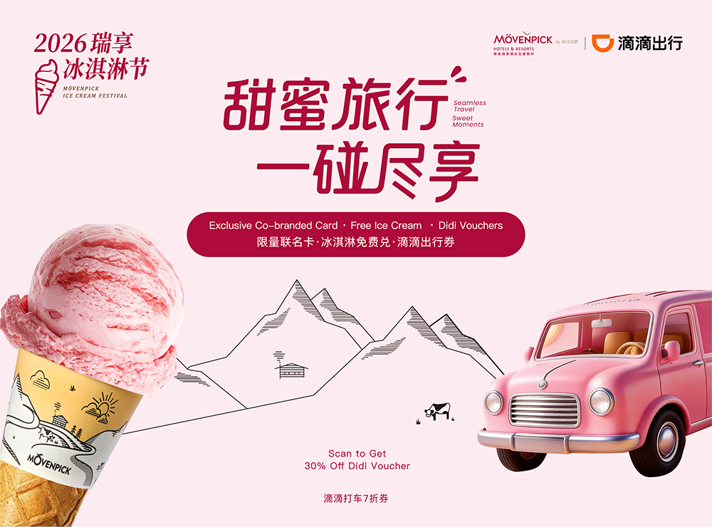 雅高瑞享以招牌Mövenpick冰淇淋为品牌甜蜜内核的核心载体,将专属甜蜜情感贯穿于用户旅行的全旅程:入住雅高瑞享用“碰一碰”一键解锁专属礼遇,以纯粹绵密的Mövenpick冰淇淋让甜蜜感成为旅居体验的记忆点,并可凭滴滴出行券随心探索城市风光、收藏春日美好——品牌的服务边界早已超越酒店物理空间,让雅高瑞享的甜蜜,伴随用户城市探索的每一步。