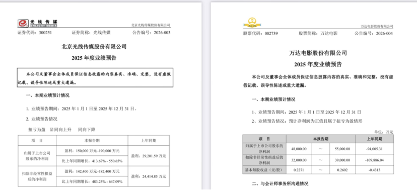 一边是博纳、欢瑞世纪等传统影视公司接连发布业绩预警,亏损、下滑成了关键词。但另一边,万达电影和光线传媒,却预告了完全不同的成绩单。