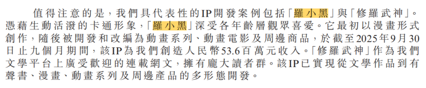 今年2月,中文在线正式向港交所递表,试图搭建“A+H”双资本平台。招股书提到,在面临业绩压力的情况下,中文在线于2023年收购“罗小黑”IP运营方寒木春华51%股权;2025年,《罗小黑战记2》电影取得了超5亿票房和豆瓣8.7的高分,其衍生品与泡泡玛特、名创优品等品牌的联名产品上线即售罄。2025年前9个月,“罗小黑”IP为中文在线贡献了5360万元收入。