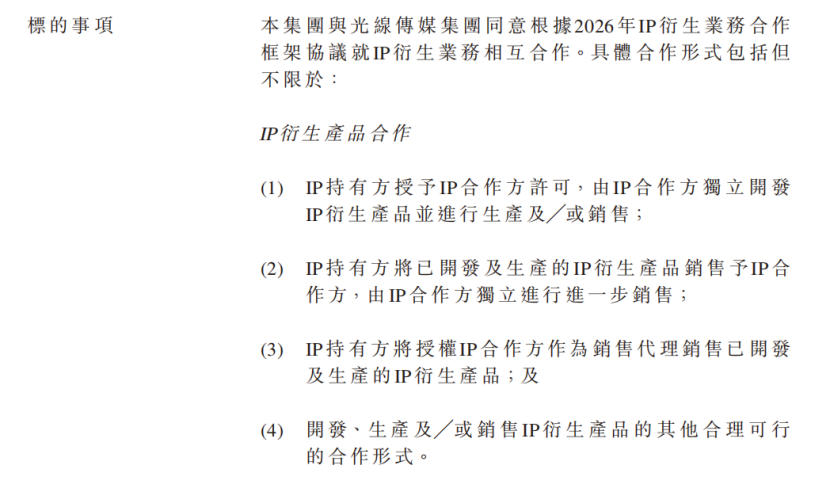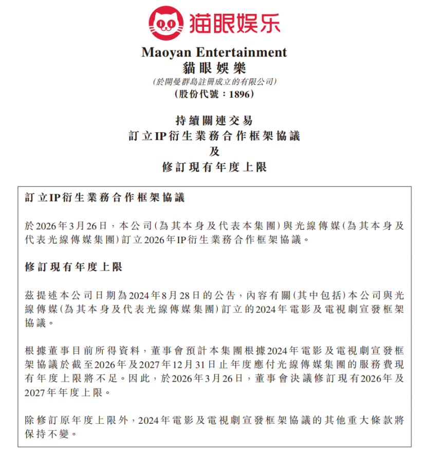 更值得关注的是,猫眼与其重要股东及长期合作伙伴光线传媒,在2026年3月26日,宣布新订立了IP衍生业务合作框架协议。影视行业的头部玩家们,正从单打独斗转向系统性、集团化地进军IP衍生市场。