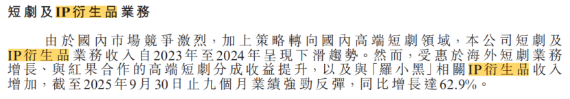 真正的亮点在于IP衍生业务。财报显示,柠萌影业【剧集衍生】收入从2024年的约142万元,猛增至2025年的1006.5万元,同比增幅高达610.3%。