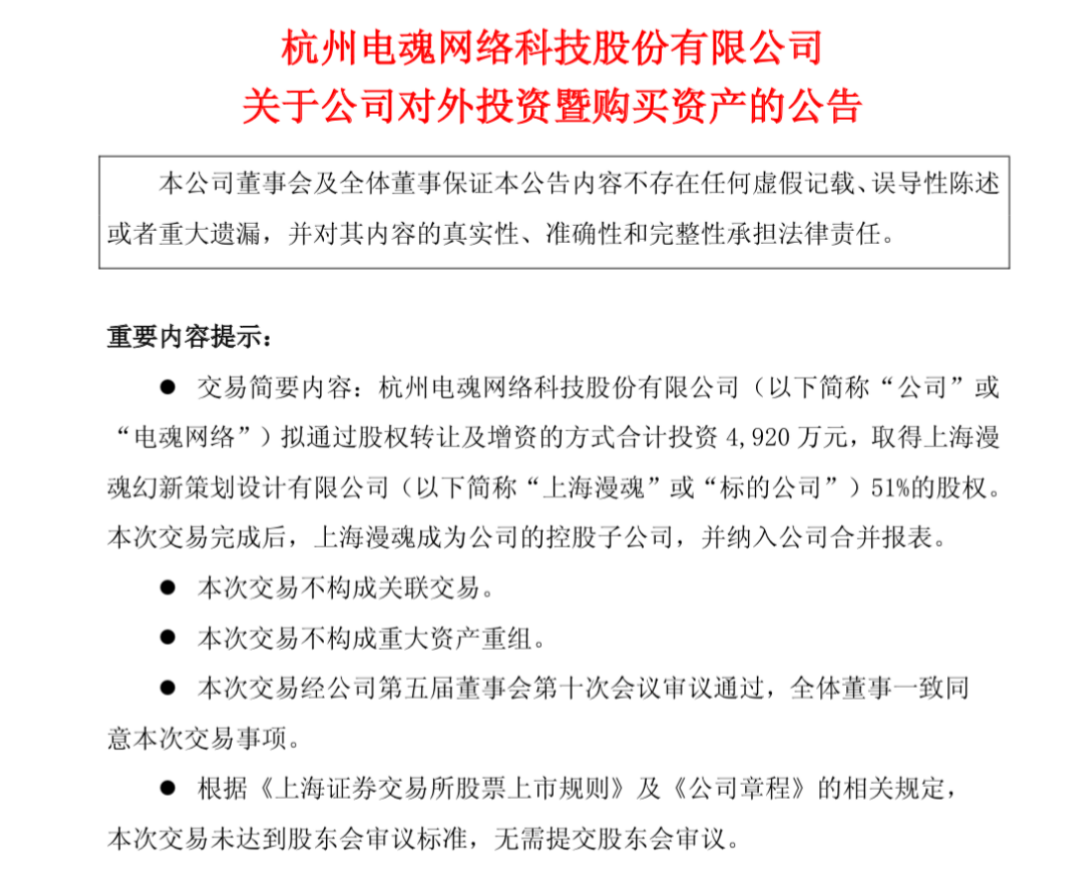 一个最新的信号来自游戏公司电魂网络。就在3月29日,电魂网络宣布投资4920万元,取得二次元衍生品企业“上海漫魂”51%的股权。电魂公告表示,要快速切入二次元衍生品这一国家重点培育的新增长赛道,构建“游戏+IP衍生品”双轮驱动。