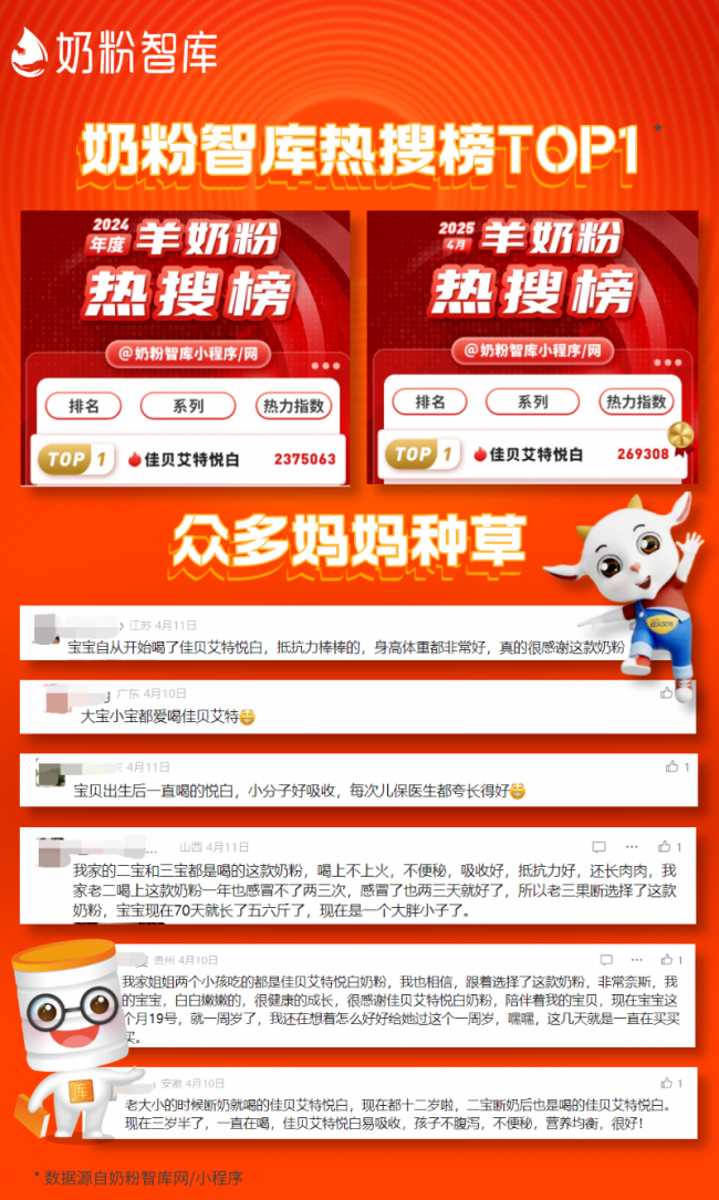 产品力最终体现在市场表现上。悦白羊奶粉长期在各大奶粉热搜榜中占据头部位置,其背后是无数家庭的真实选择。小红书上有超万名妈妈证言佳贝艾特羊奶粉喂养效果好,还有超400名医学及营养专家亲测推荐。当然佳贝艾特不只是全球羊奶领域销量第一的品牌,品牌力更是稳居行业TOP1,京东平台数据显示,目前佳贝艾特羊奶粉已收获超过200万消费者真实好评。佳贝艾特凭借自身硬实力,一步步成长为经得起市场考验的品质选择。