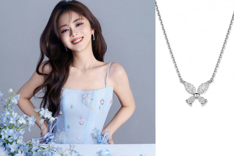 颈间的 BOTANICA 系列马眼水滴钻蝴蝶吊坠,以马眼与梨形钻石勾勒轻盈蝶翼。多角度镶嵌令光线自由流转,折射出如晨露般清透的光泽。蝴蝶象征蜕变与新生,正如春天赋予世界的再生力量,也映照演员身上那份从容而坚定的生命感。