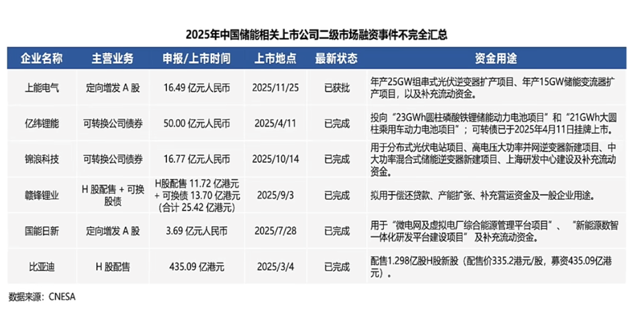 其中,比亚迪完成435.09亿港元配售,用于加强全球业务体系建设;亿纬锂能(300014.SZ)发行50亿元可转债,投向储能电池领域;上能电气(3000827.SZ)融资16.49亿元,聚焦逆变器产能扩建与数智化建设。