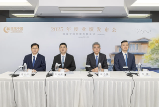 3月31日下午,绿城中国召开2025年业绩发布会,主席台上,执行总裁周长江、董事长刘成云、代理行政总裁耿忠强和副总裁李骏从左到右依次就坐。