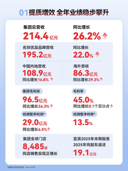 财报显示,2025年名创优品集团全球零售额达371亿,财务总营收达214.4亿元,同比增长26.2%,其中名创优品品牌营收195.2亿元,同比增长22.0%,TOP TOY品牌营收19.2亿元,实现94.8%的同比增长。名创优品集团该年度毛利润为96.5亿元,同比增长26.3%,毛利率为45.0%,同比增长0.1个百分点。经调整净利润(非国际财务报告准则(Non-IFRS))29.0亿元,同比增长6.5%,经调整净利率13.5%,展现出核心业务的强大韧性和企业整体良好的盈利能力。集团全球门店达8485家,集团同店销售实现稳健增长。与此同时,名创优品积极回馈股东,宣派2025年末期股息,2025年向股东返还人民币19.1亿元,其中包括5.5亿元股份回购及13.6亿元分红,共占经调整净利润的66%,为股东创造并分享长期价值。