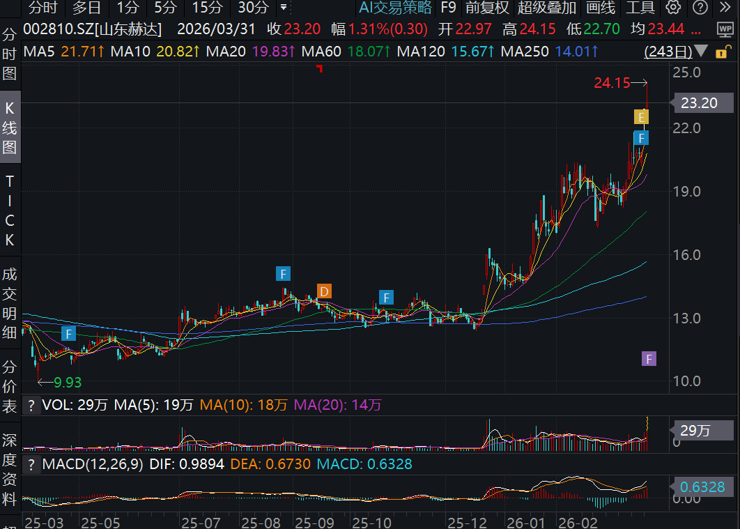 股价方面,3月30日,山东赫达实现“10cm”涨停;3月31日,公司股价继续上涨,盘中触及近1年最高价24.15元,较2025年4月9日股价最低点9.93元大涨143.20%。