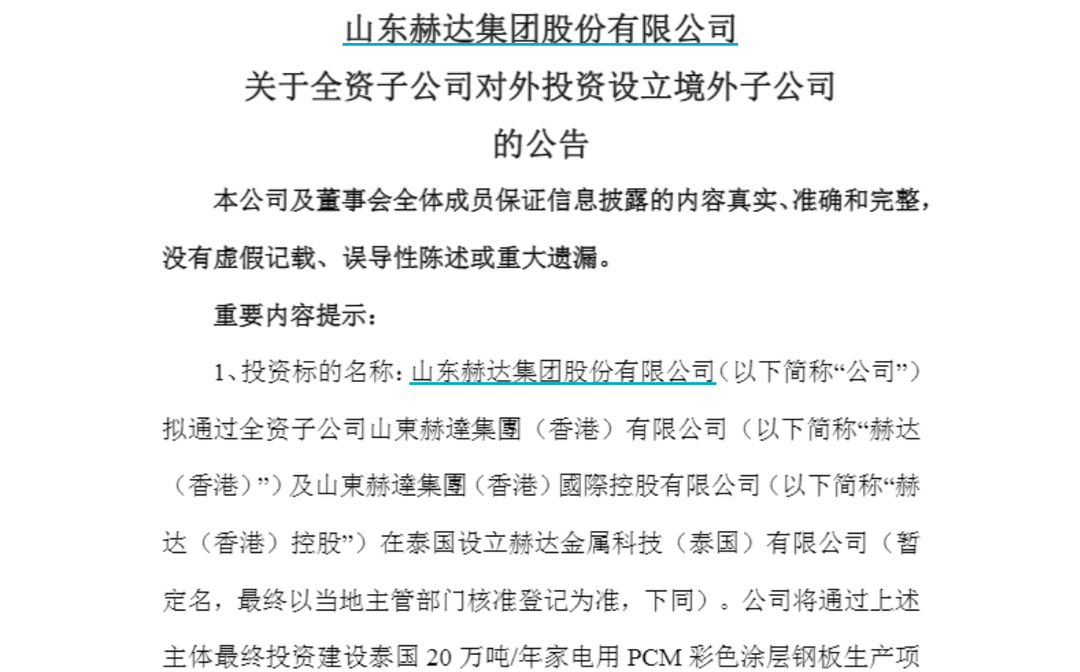 山东赫达将通过赫达(泰国)以自有(自筹)资金投资1.2亿元人民币(或等值外币,最终投资总额以实际投资为准)建设泰国20万吨/年家电用PCM彩色涂层钢板生产项目,建设家电用PCM彩涂钢板生产线及配套加工中心。