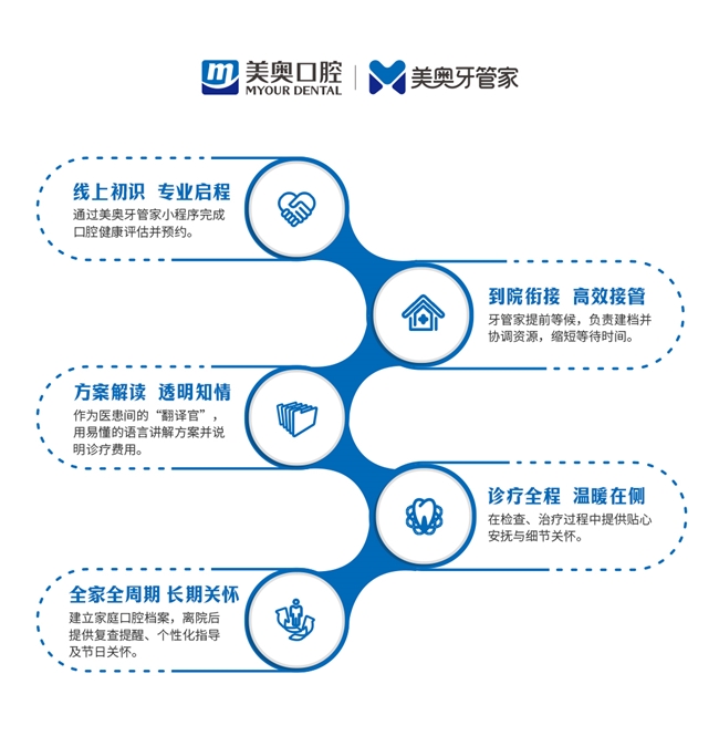 这正是“美奥牙管家服务体系”希望构建的服务场景:一个从前台接待、线上咨询到医护协同的全链路协作网络。它确保用户不论通过哪个触点进入美奥,都能获得连贯、可靠、有温度的支持,将预防、治疗、长期管理的责任由一个看得见、找得到的团队主动承担起来。