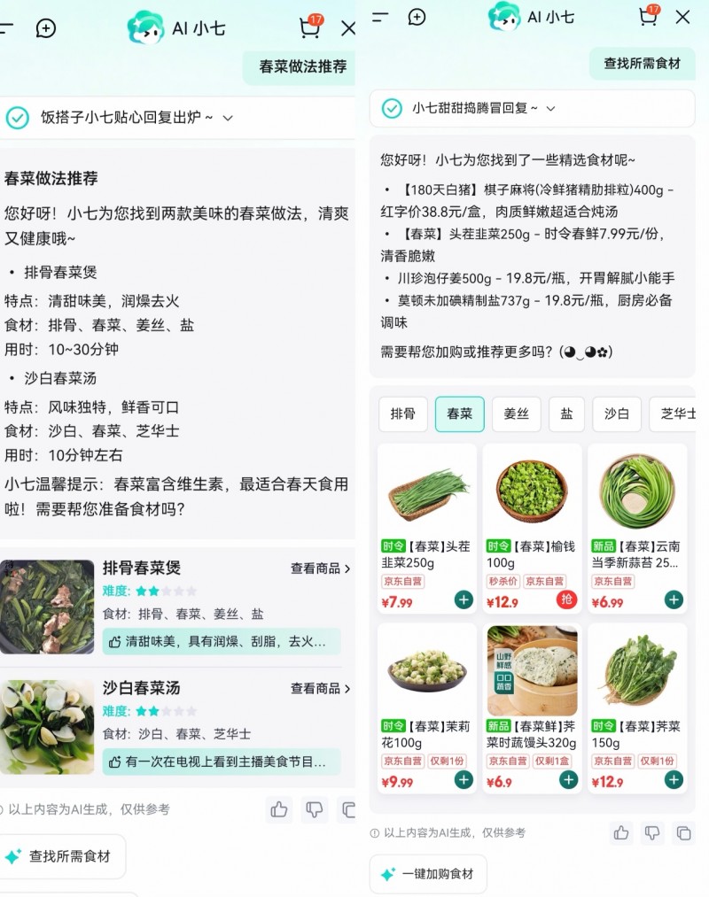 晚上想做个春菜“尝鲜”,但不知道做法和食材搭配;临近夏天,哪些轻食减脂餐健康做起来又方便……类似这样日常消费中的困惑与决策,过去往往需要来回切换软件搜索、筛选与比价,耗时且操作繁琐。而现在,用户仅需在京东七鲜超市的APP或小程序中向AI 小七直接提出需求,即可在数秒内获得从食谱建议、商品匹配到一键加购及售后咨询的完整服务。