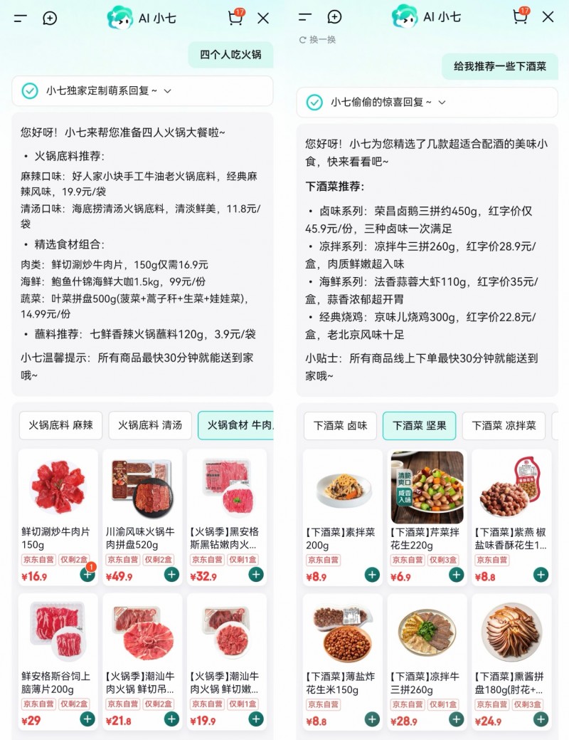 如果你还未体验过AI 小七,不妨打开京东七鲜的APP 或小程序,点击主页底部的AI 小七入口,让它为你推荐今日食谱,解锁更轻松、更智能的购物新方式。